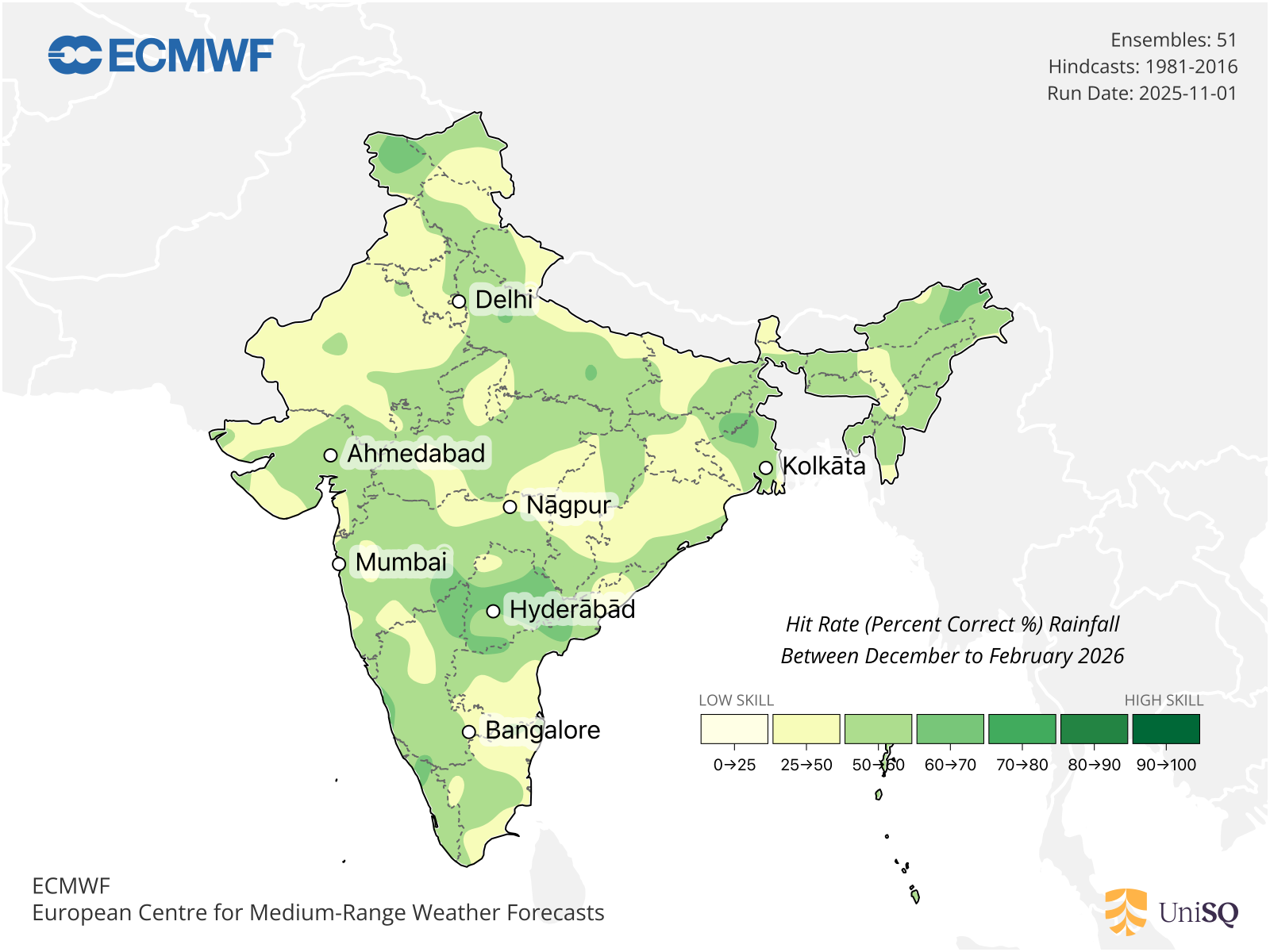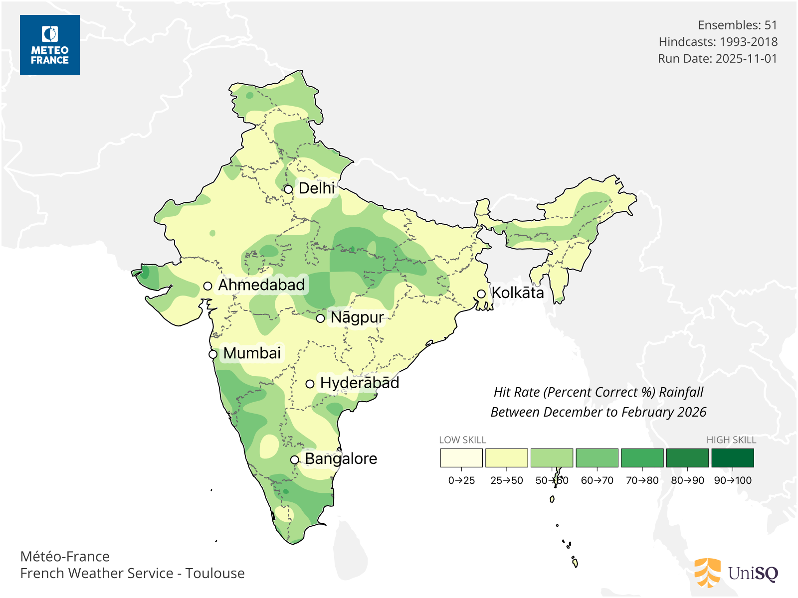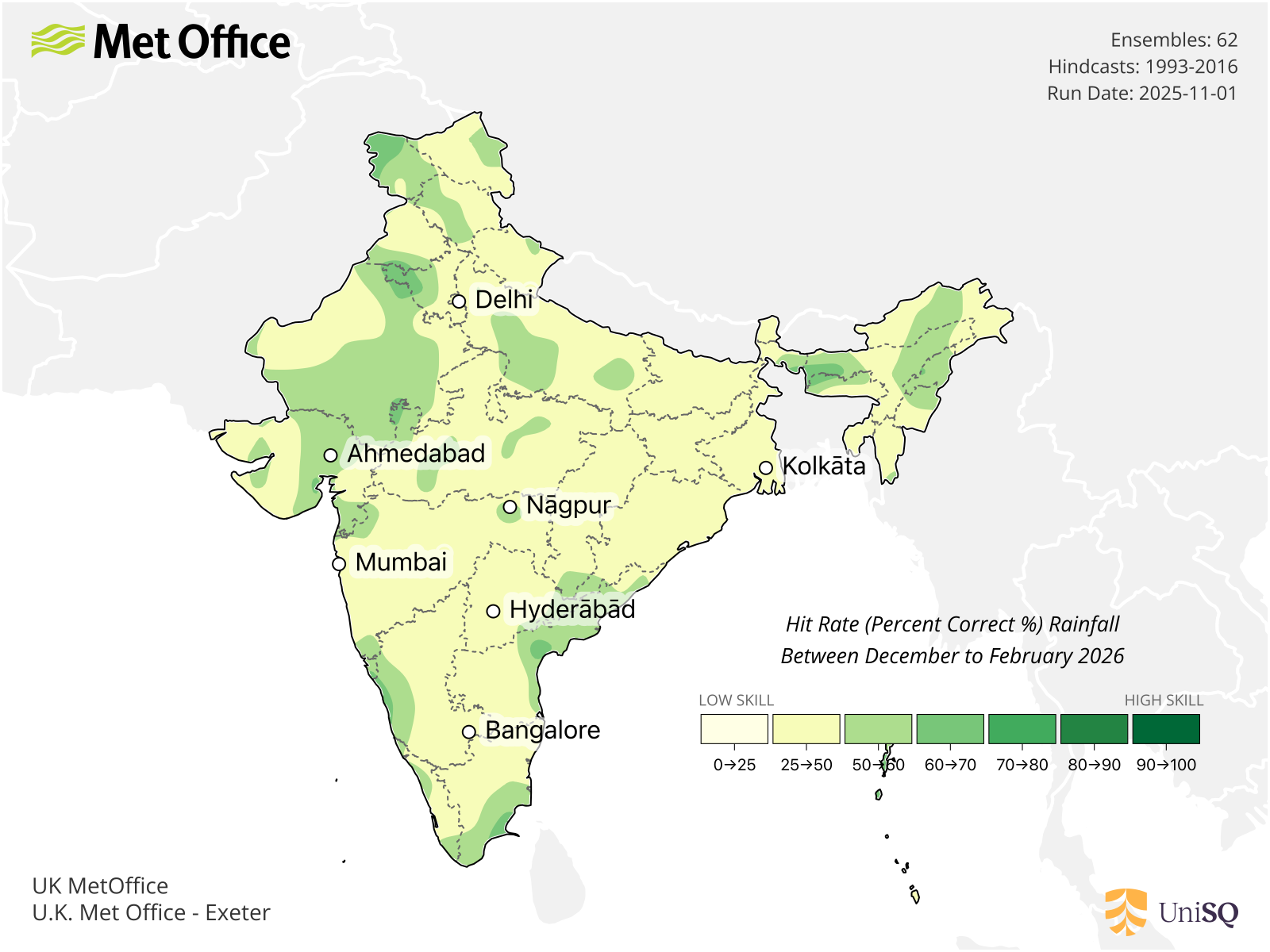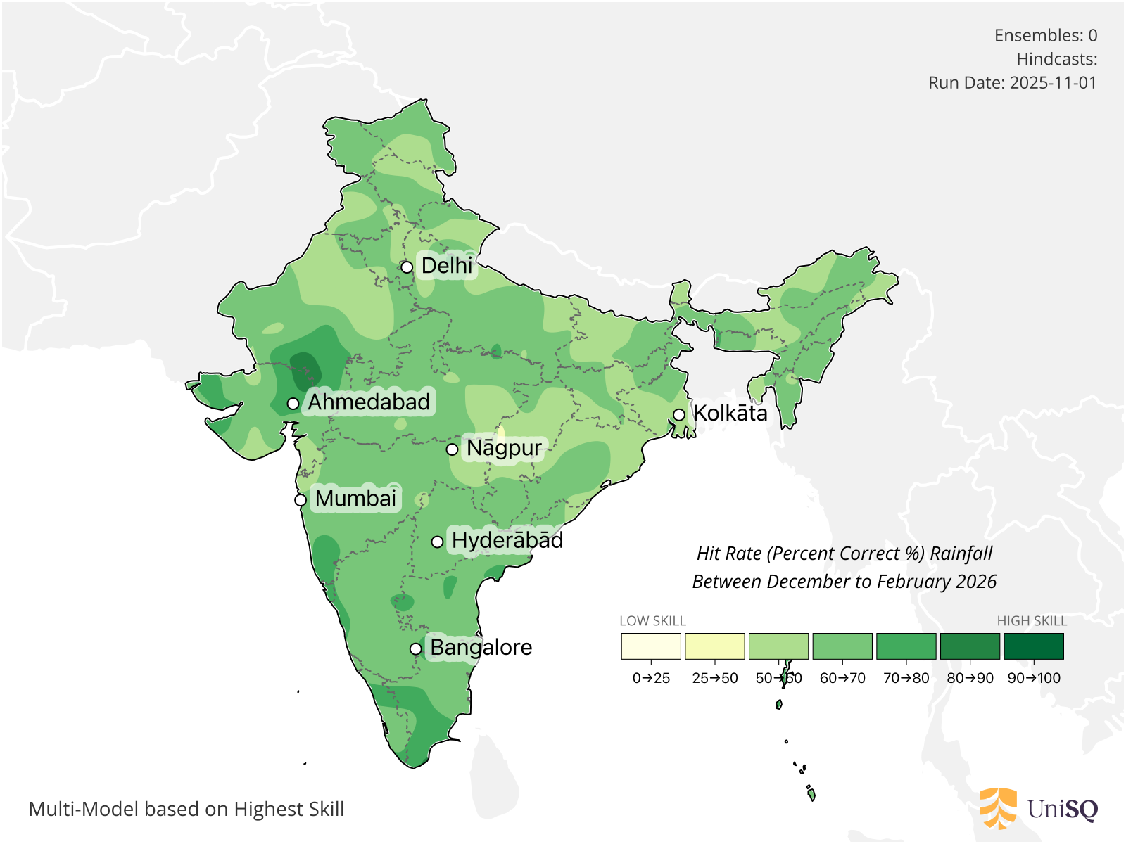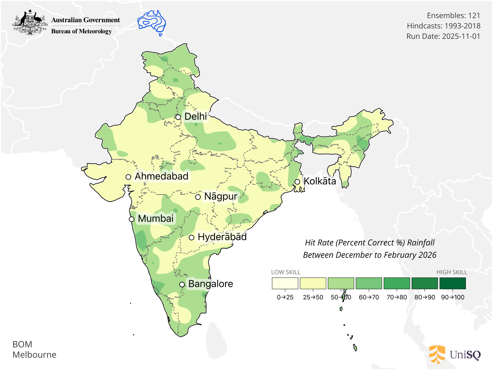 For each model the skill is calculated by comparing the modelled hindcasts with the observed values for the same region and season using Gridded Climate Data. For the current set of models the Skill is calculated using the hindcast values from 1993-2016.