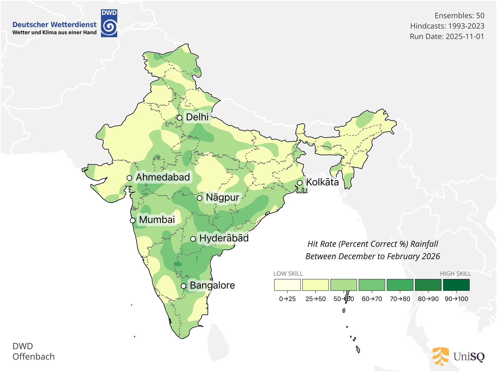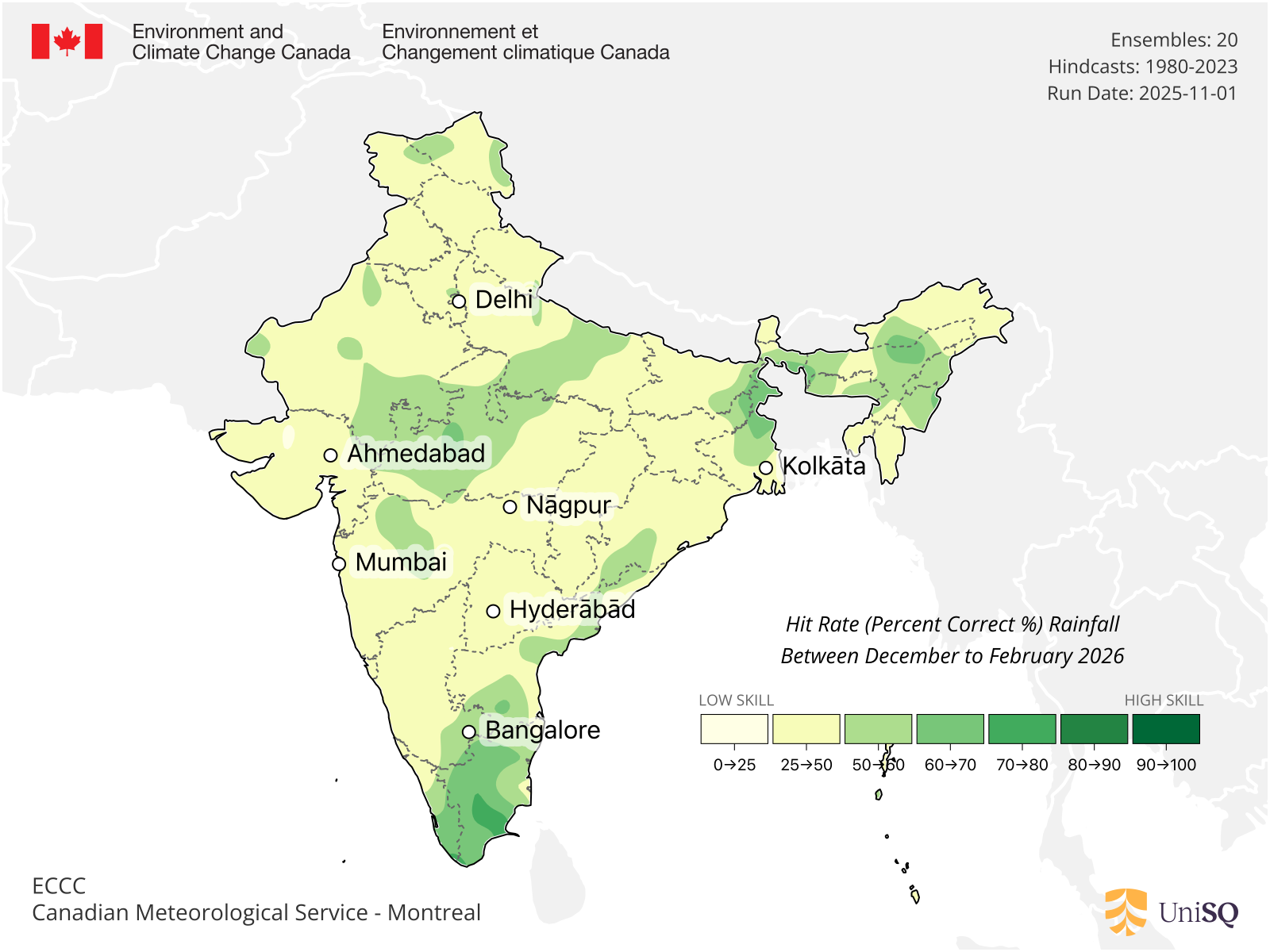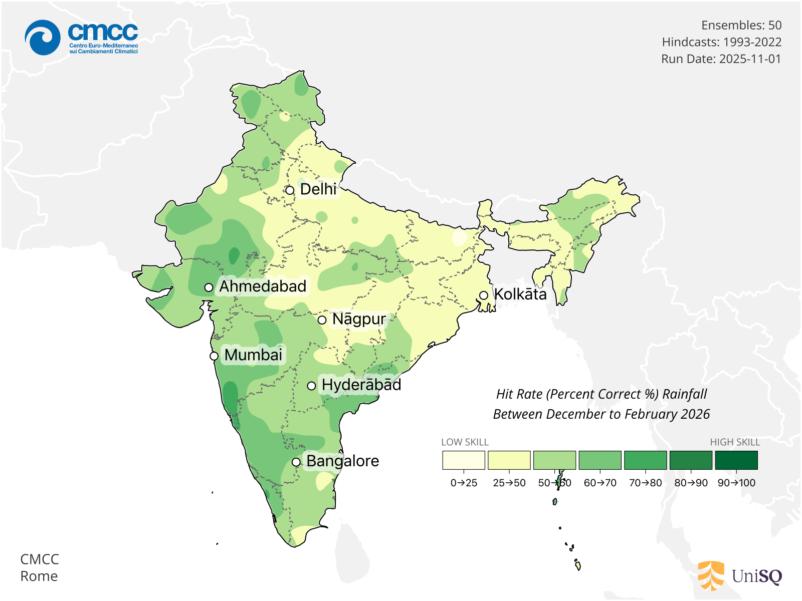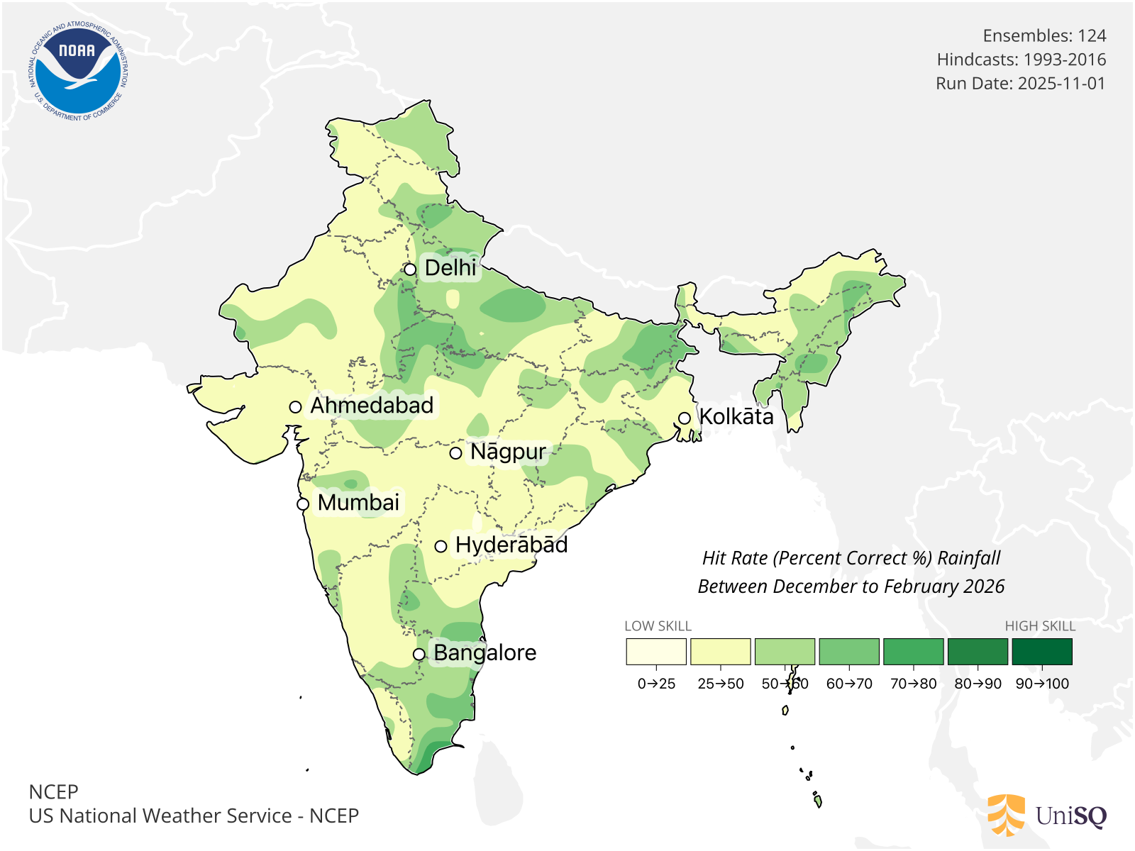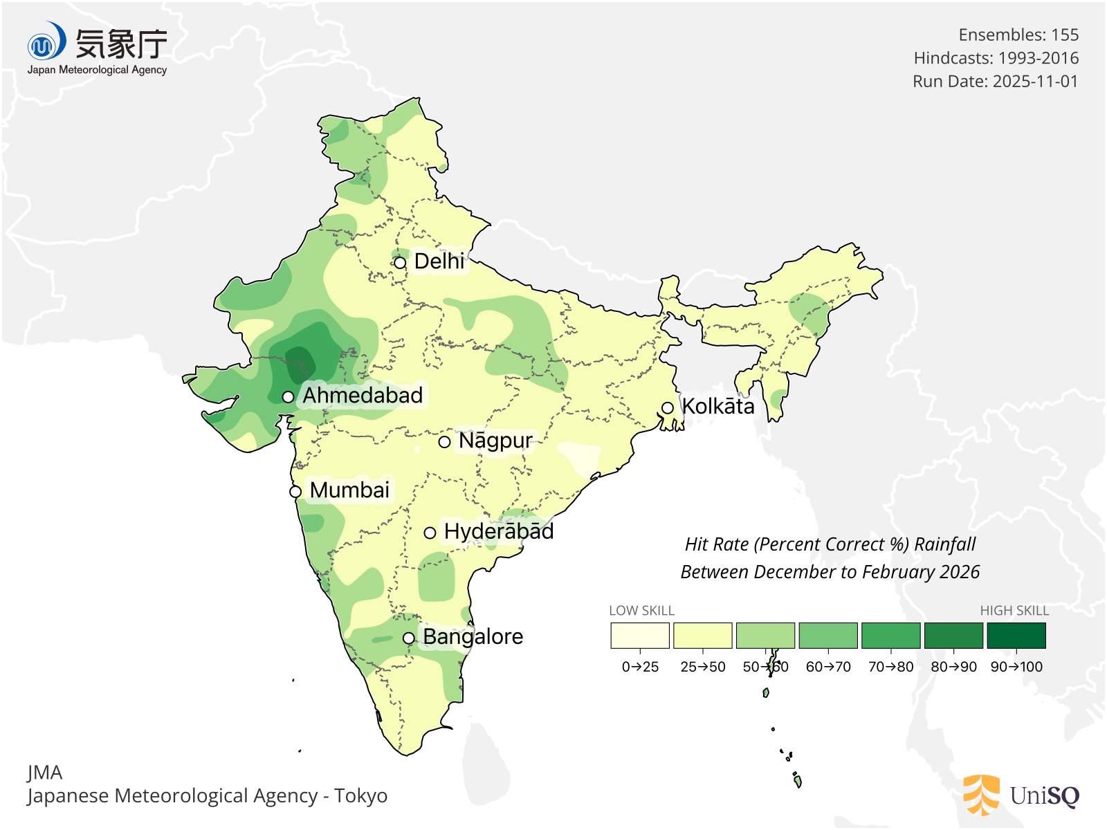 For each model the skill is calculated by comparing the modelled hindcasts with the observed values for the same region and season using Gridded Climate Data. For the current set of models the Skill is calculated using the hindcast values from 1993-2016.