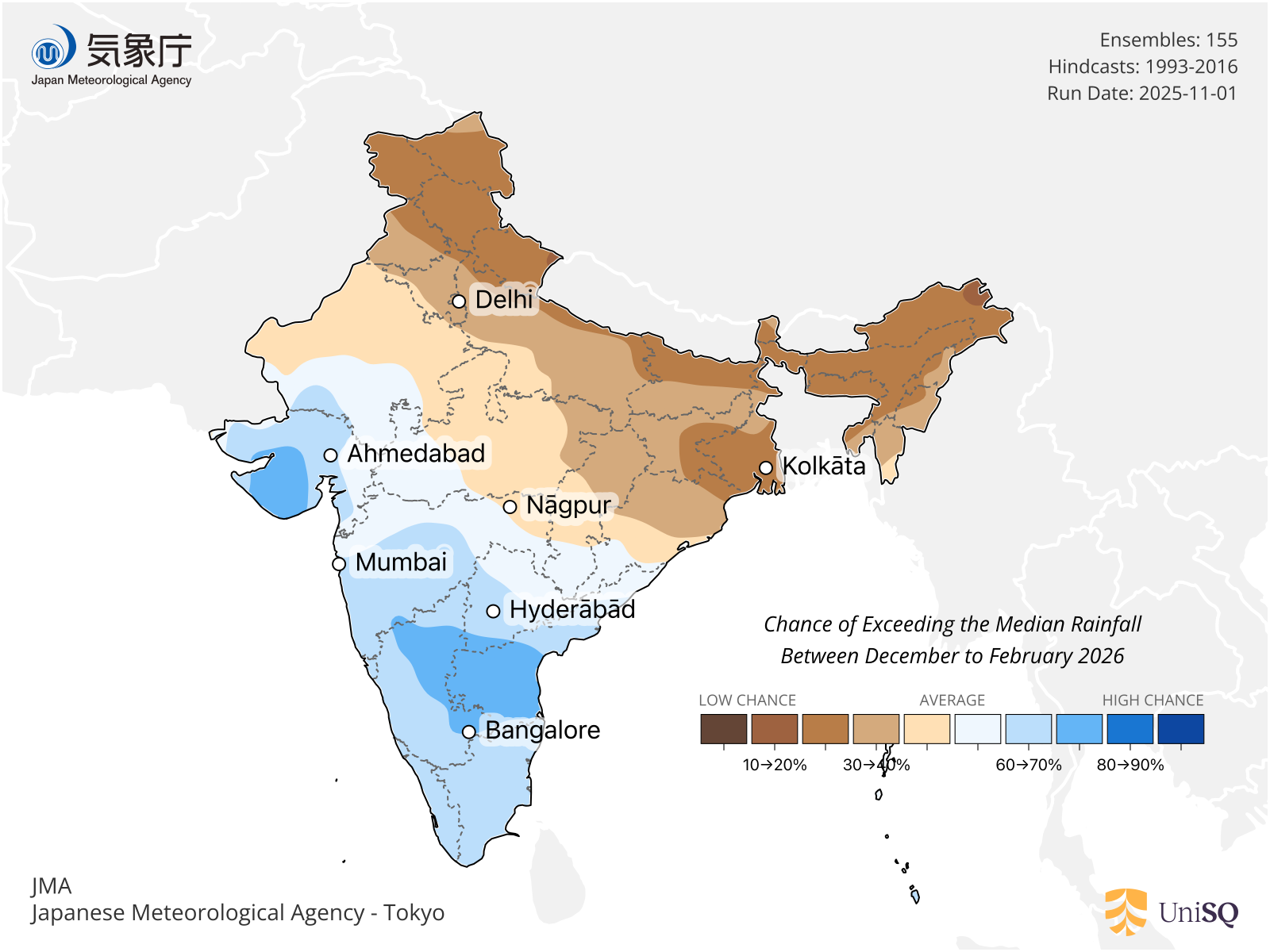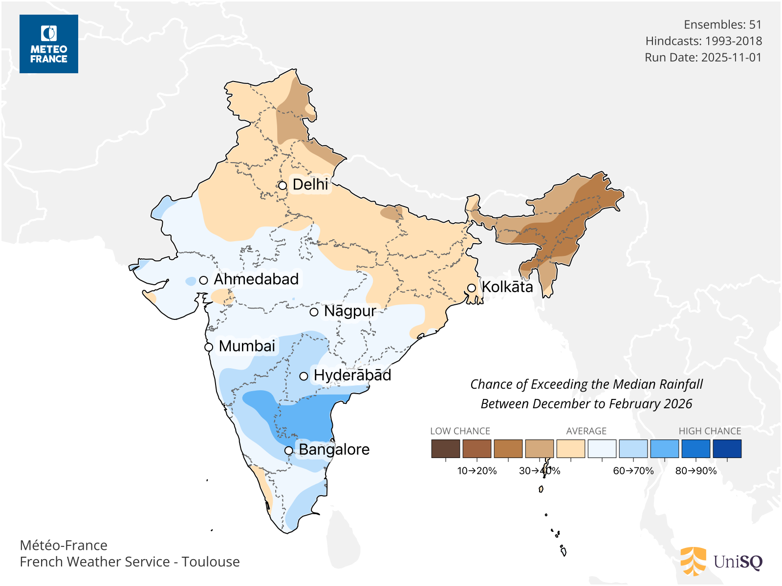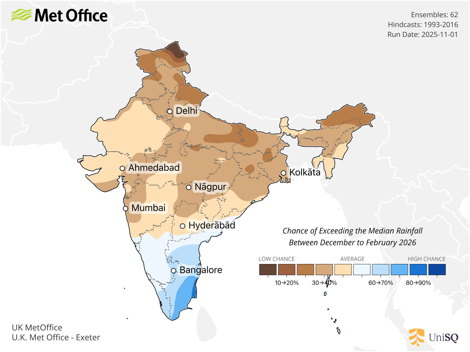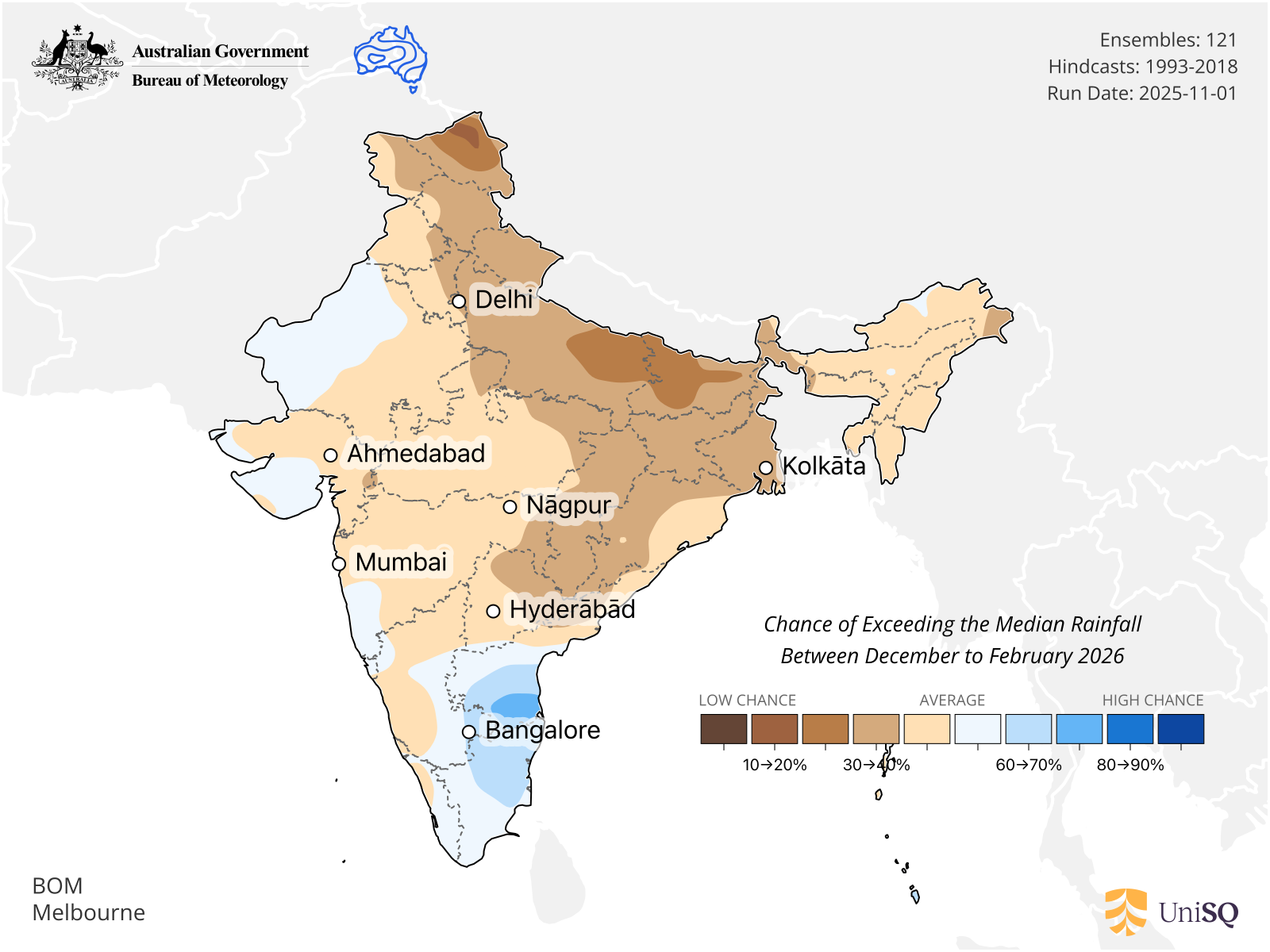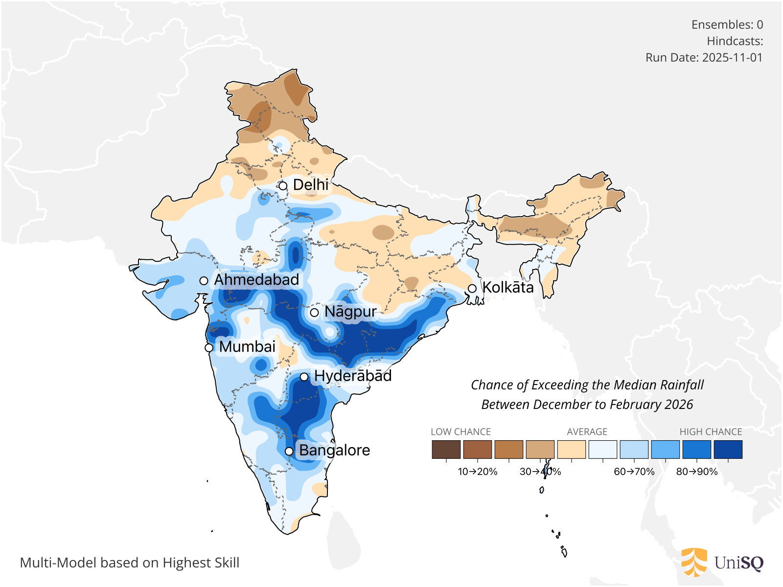 For each model the skill is calculated by comparing the modelled hindcasts with the observed values for the same region and season using Gridded Climate Data. For the current set of models the Skill is calculated using the hindcast values from 1993-2016.